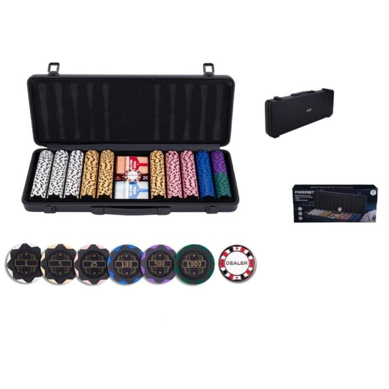 Zestaw do pokera. Zawiera dwie talie kart, 500 żetonów (z wartością), 1 metalowy żeton rozdającego, pięć kości i czarne aluminiowe etui z zaokrąglonymi rogami. - 150 x 1 EUR - 150 x 5 EUR - 100 x 25 EUR - 50 x 100 EUR - 25 x 500 EUR - 25 x 1000 EUR
