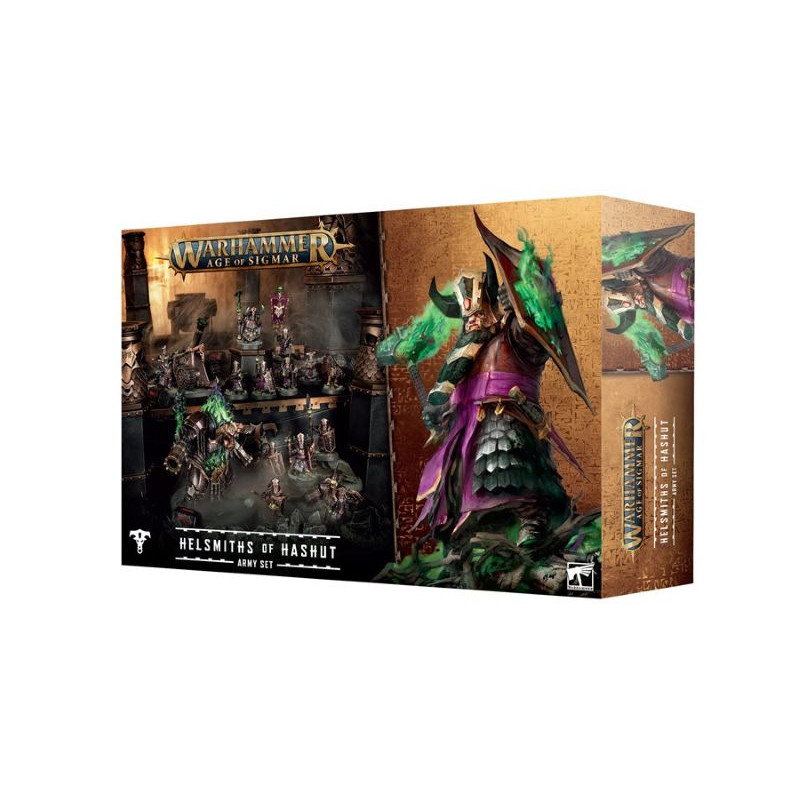 – Chaos Battletome: Helsmiths of Hashut, a 90-page hardback book with a soft-touch cover and artwork unique to this boxed set