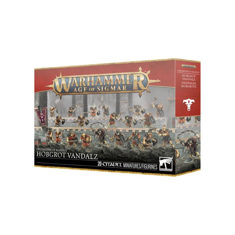 This multipart plastic kit builds 20 Hobgrot Vandalz, light infantry for your Helsmiths of Hashut armies in games of Warhammer Age of Sigmar. They are ideal for overrunning your foes, protecting vital units, and taking exposed objectives. Equipped with shields and scavenged weapons, including a mix of hammers, blades, and picks, they are ready to get stuck in. The kit also includes parts to build two optional standard bearers, musicians, and champions armed with your choice of dagger or chain weapon.